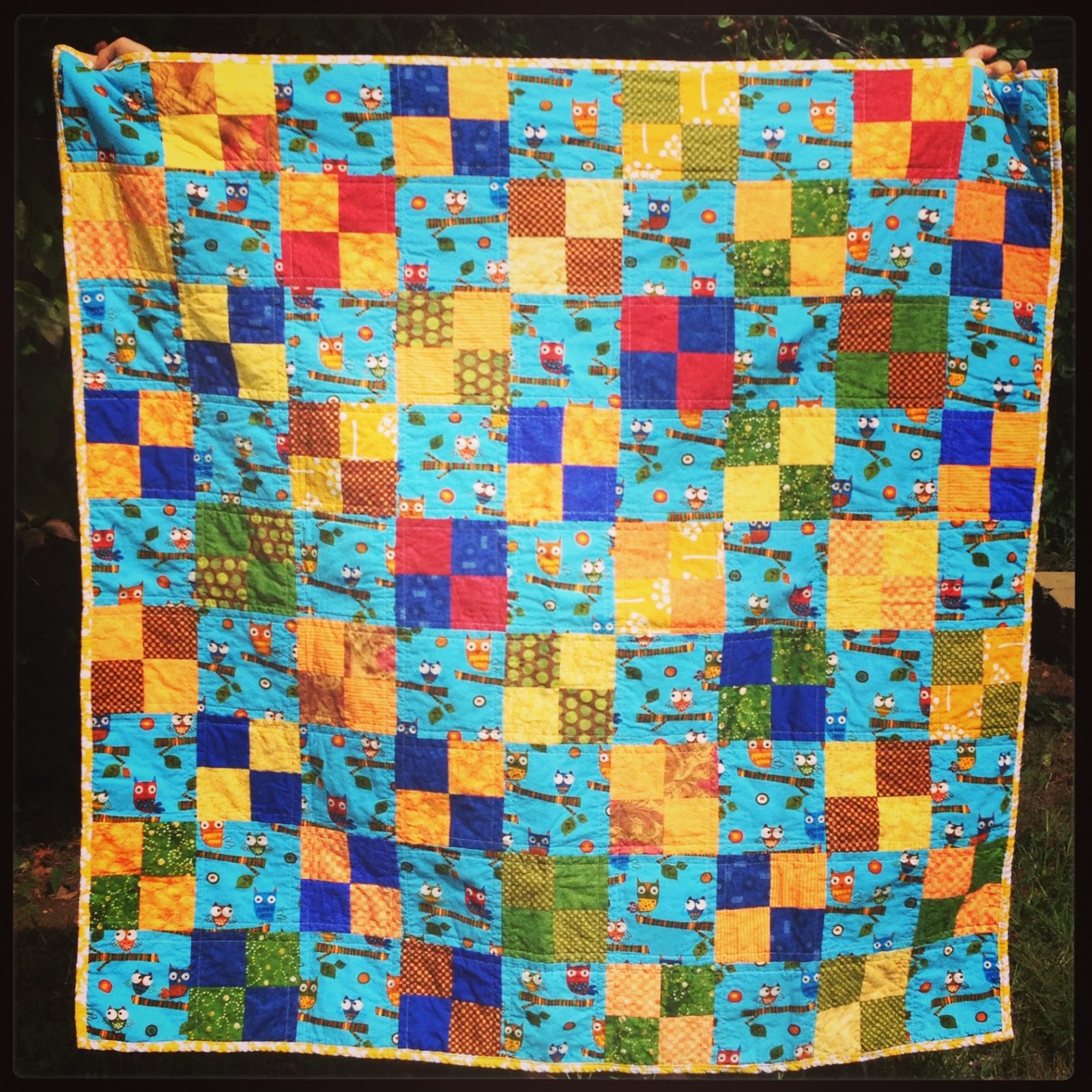 When a friend told me she expecting a little boy this fall, I decided it was time to use my beautiful owl fabric. I did a simple four-patch and all fabric, including the backing, came from my stash.