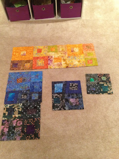 This quilt is gorgeous, isn't it? It is a work of art, containing hundreds of hand dyed pieces. I decided to go for it; deciding I could imitate the effect with several different batik cuts. I had no batik's in my stash but I've been wanting to make a batik quilt for quite some time. This was the perfect excuse. I told her I couldn't replicate the quilt but it would serve as inspiration for whatever I made for her.